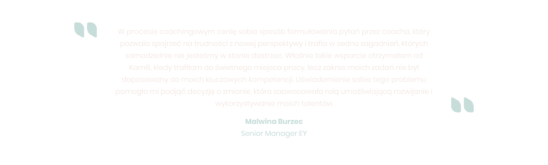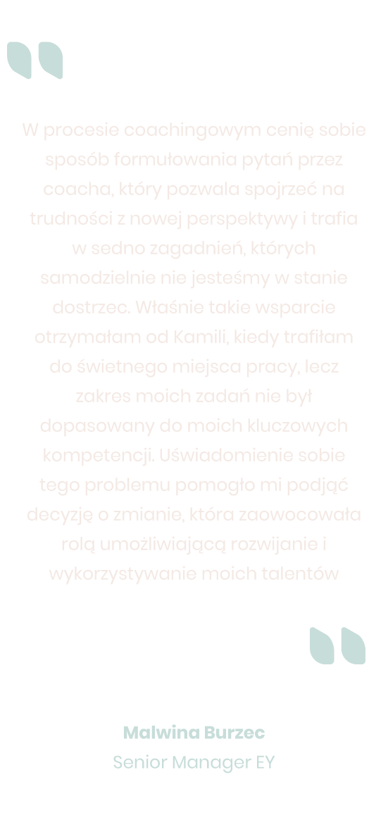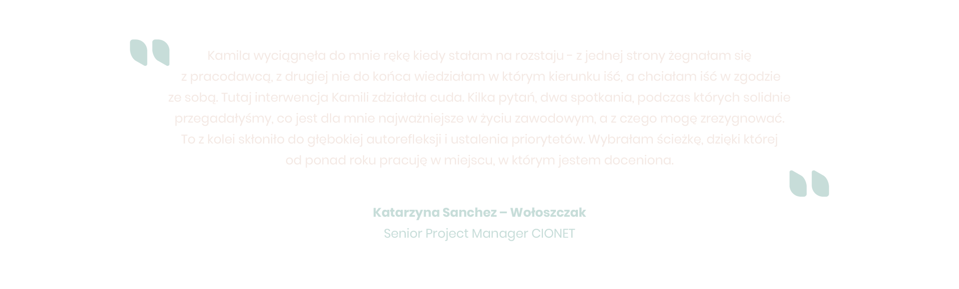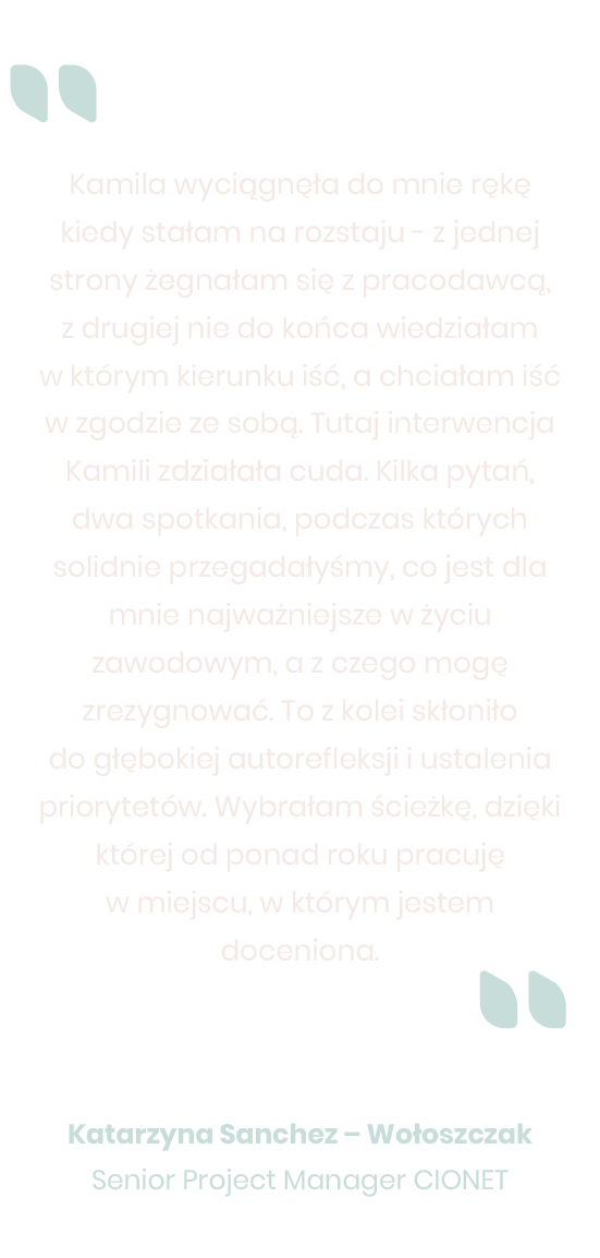 z pracodawcą, z drugiej nie do końca wiedziałam w którym kierunku iść, a chciałam iść w zgodzie ze sobą. Tutaj interwencja Kamili zdziałała cuda. Kilka pytań, dwa spotkania, podczas których solidnie przegadałyśmy, co jest dla mnie najważniejsze w życiu zawodowym, a z czego mogę zrezygnować.