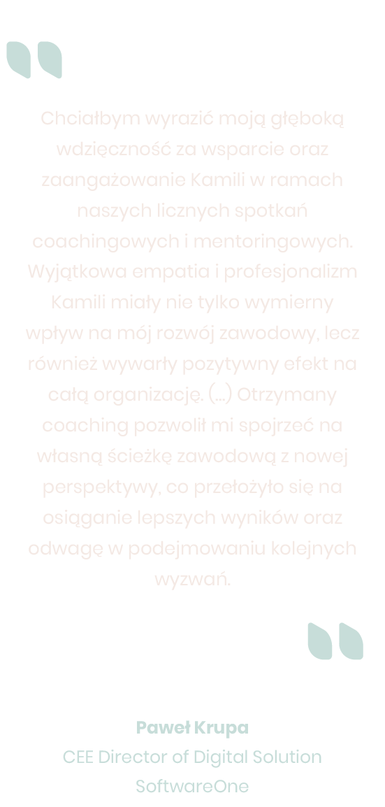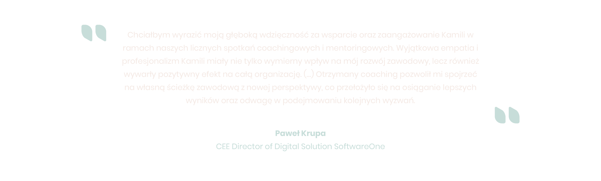 Jestem certyfikowaną coachką liderek i liderów (PCC ICF) z ponad 2000 godzin rozmów rozwojowych. Pracuję w nurcie coachingu transformacyjnego, który pozwala sięgnąć głębiej – do wartości, przekonań i wewnętrznych zasobów. Moi klienci mówią, że przy mnie mogą po prostu być sobą. To największy komplement.