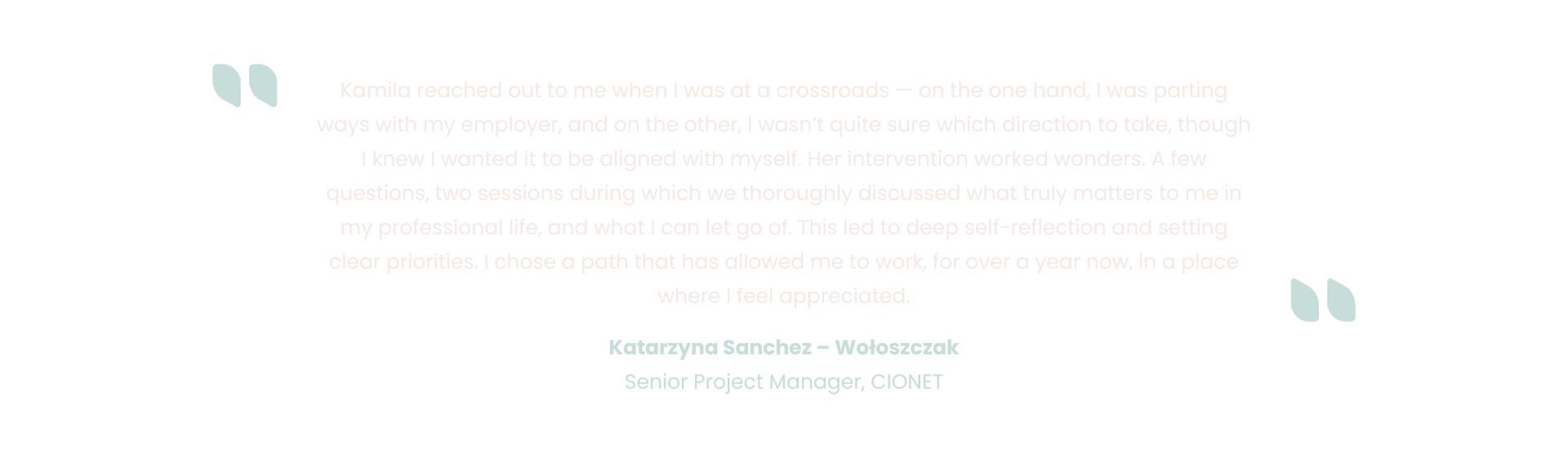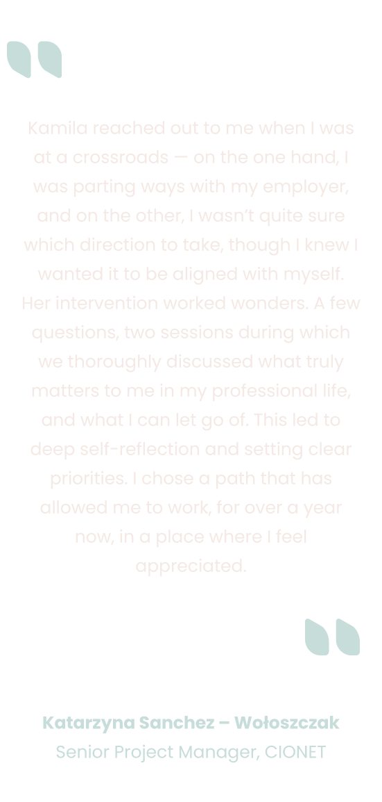 z pracodawcą, z drugiej nie do końca wiedziałam w którym kierunku iść, a chciałam iść w zgodzie ze sobą. Tutaj interwencja Kamili zdziałała cuda. Kilka pytań, dwa spotkania, podczas których solidnie przegadałyśmy, co jest dla mnie najważniejsze w życiu zawodowym, a z czego mogę zrezygnować.